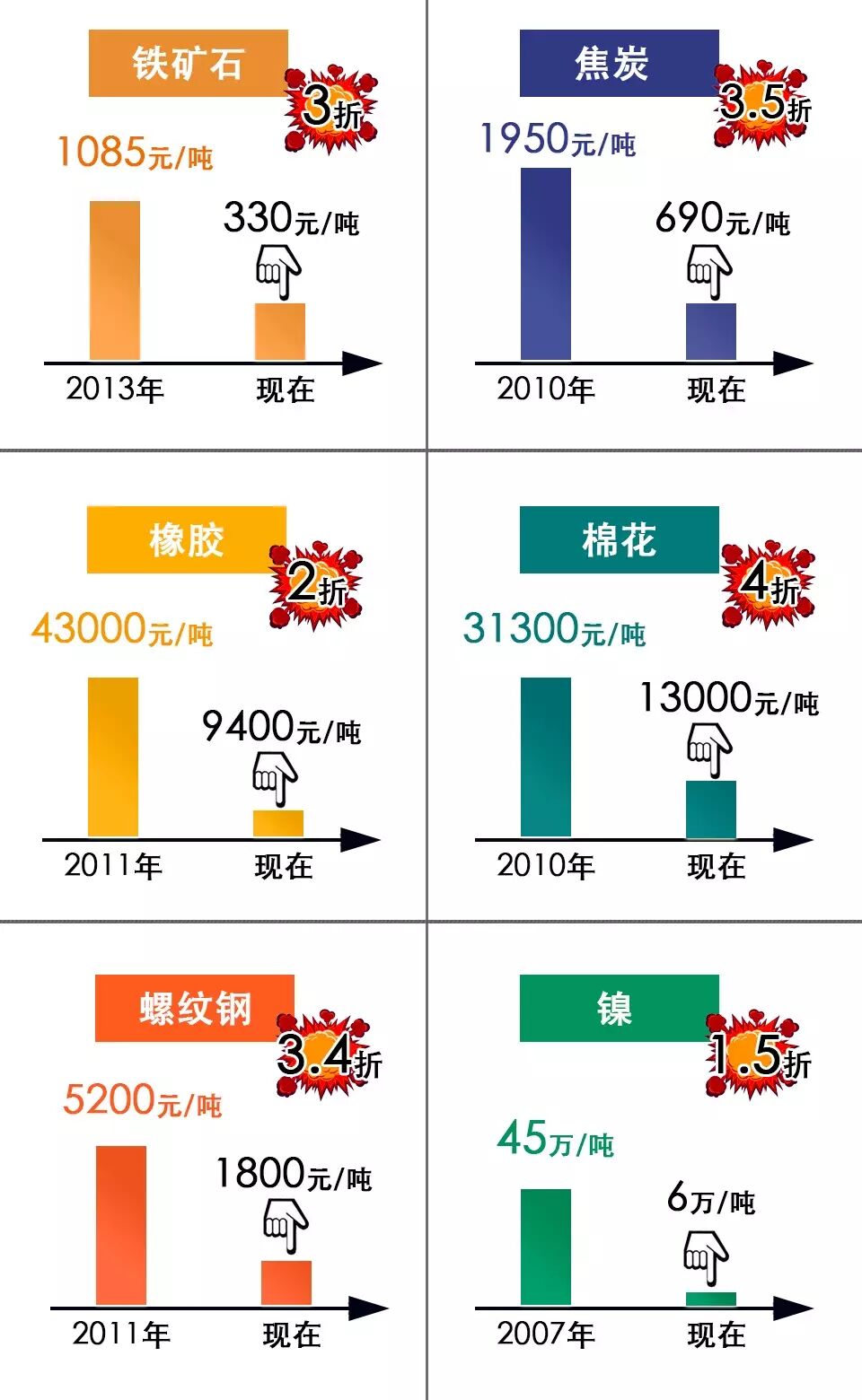 如果看完这些数据,你印象还不够深刻,那么,我们来看看几种代表性的商品的价格变化,简直就是挥泪大甩卖——