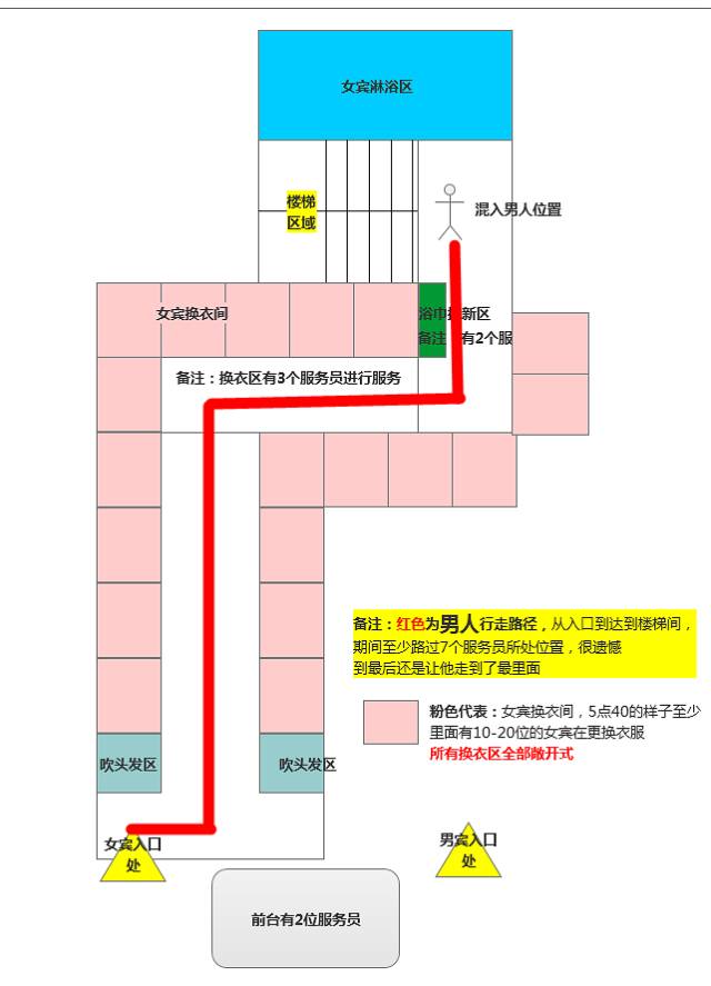 奇葩的事情来了: 从黄山温泉的大厅女宾入口处竟然放进来一个男人(特征:年纪50多岁,头发花白,身穿黑色上衣),从入口处一路畅通走到通往淋浴区的楼梯口处,期间完整的走完整个女宾更衣区没有一个服务员阻拦,路过更衣区到浴巾换取区也没有阻拦,到最后通往女宾淋浴楼梯间,才有2个服务员在所有女宾的尖叫下,出来制止。