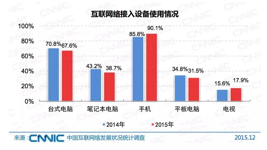 中国网民通过台式电脑和笔记本电脑接入互联网的比例分别为67.6%和38.7%;手机上网使用率为90.1%,较2014年底提高4.3个百分点;平板电脑上网使用率为31.5%;电视上网使用率为17.9%。