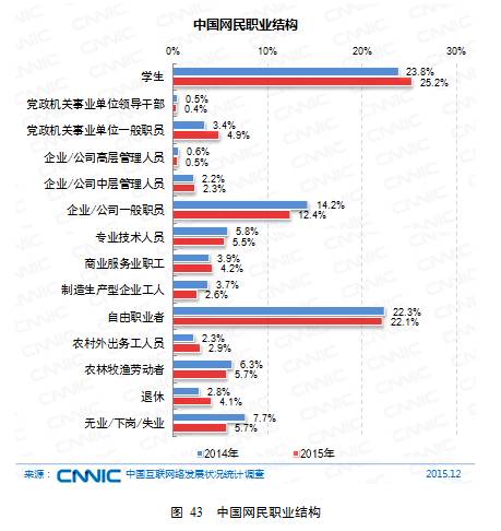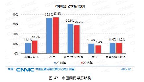 中国网民继续向低学历人群扩散。截至2015年12月,网民中具备中等教育程度的群体规模最大,初中、高中/中专/技校学历的网民占比分别为37.4%、29.2% 。