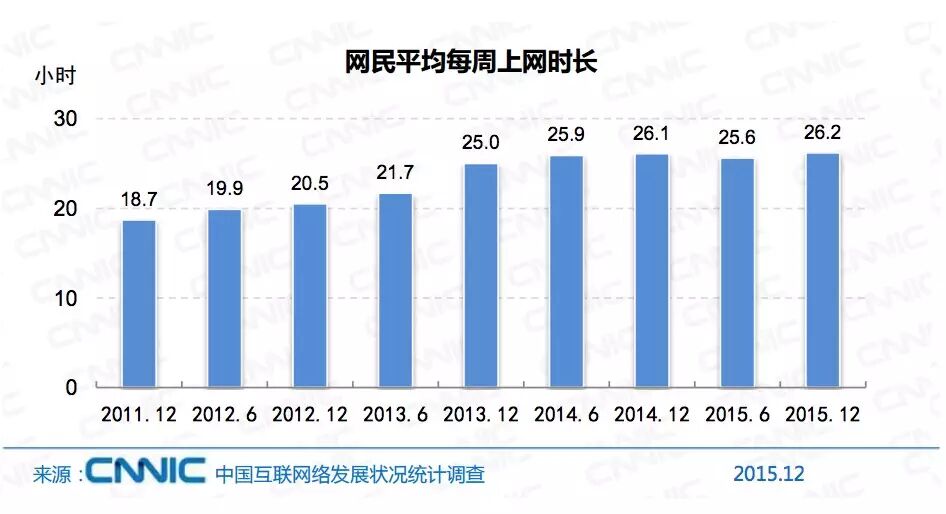2015年,中国网民的人均周上网时长为26.2小时,与2014年基本持平。