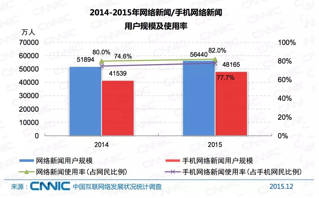 截至2015年12月,我国网络新闻用户规模为5.64亿,其中手机网络新闻用户规模为4.82亿,与2014年底相比增长了6626万,增长率为16.0%,网民使用率为77.7%,相比2014年底增长3.1个百分点。