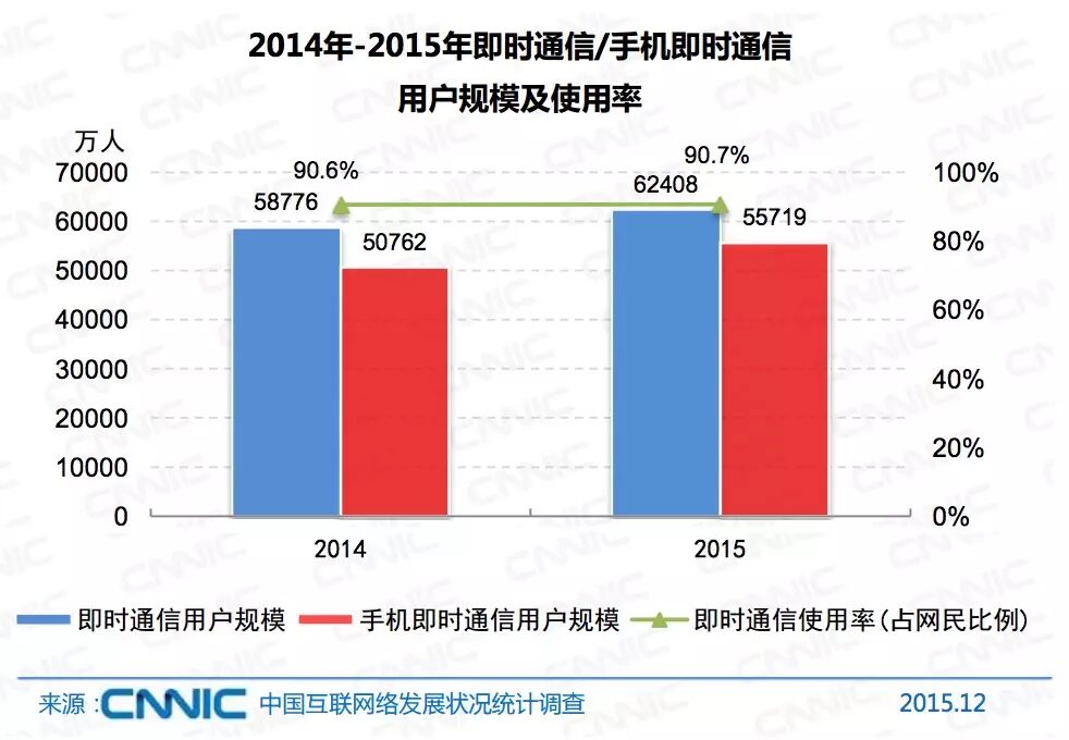 截至2015年12月,网民中即时通信用户规模达到6.24亿,其中手机即时通信用户5.57亿,占手机网民的89.9%。即时通信的网民使用率仍为各类应用最高,且用户规模还在不断提升。对于主流即时通信来说,由于用户使用率已经基本见顶,其发展方向开始由满足用户的基础沟通需求转向对新业务的探索。