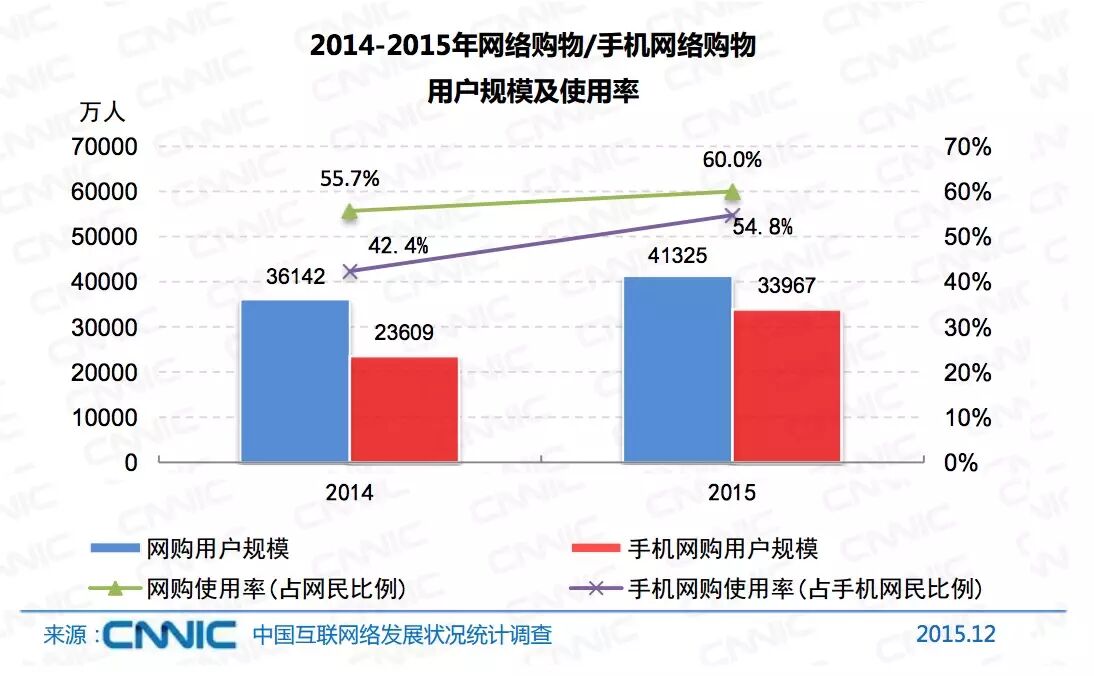 截至2015年12月,我国网络购物用户规模达到4.13亿,较2014年底增加5183万,增长率为14.3%。手机网络购物用户规模增长迅速,达到3.40亿,增长率为43.9%,手机网络购物的使用比例由42.4%提升至54.8%。网络零售企业深挖农村市场消费潜力,农村地区网购用户占比达到22.4%,阿里巴巴、京东、苏宁等电商平台在农村建立电商服务站,招募农村推广员服务于广大农村消费者。