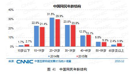 我国网民以10-39岁群体为主,占整体的75.1%。其中20-29岁年龄段的网民占比最高,达29.9%,10-19岁、30-39岁群体占比分别为21.4%、23.8% 。与2014年底相比,10岁以下低龄群体和40岁以上中高龄群体的占比均有所提升,互联网继续向这两部分人群渗透。