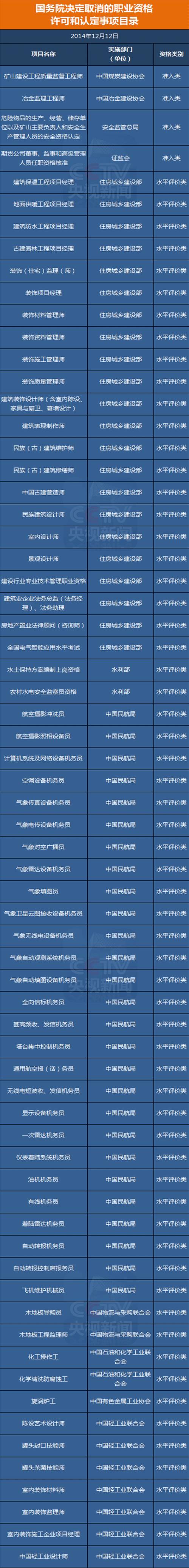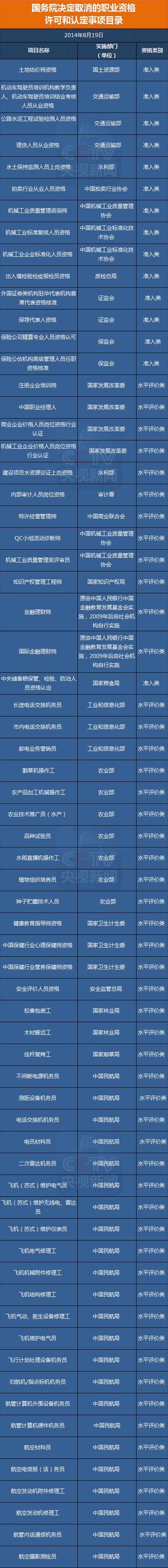 1月13日国务院常务会议决定,在此前分四批取消211项职业资格的基础上,再取消61项职业资格许可和认定事项。同时,尽快公布国家职业资格目录清单,目录之外不得开展职业资格许可和认定。