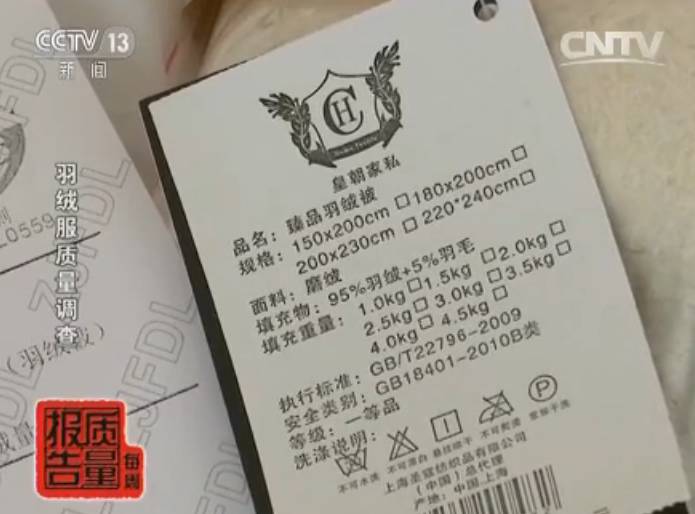 记者了解到,其中一条标称为皇朝家私臻品羽绒被,在吊牌上标注填充物为95%羽绒加5%羽毛,而检测报告显示,这条羽绒被添充物绒子的含量为零、化纤棉的含量为35.2%。 由于杂质多、粉尘多、绒丝多、羽丝多,这种羽绒制品容易发生钻毛的现象,容易引起消费者过敏、哮喘,容易生病,对儿童影响更加严重。