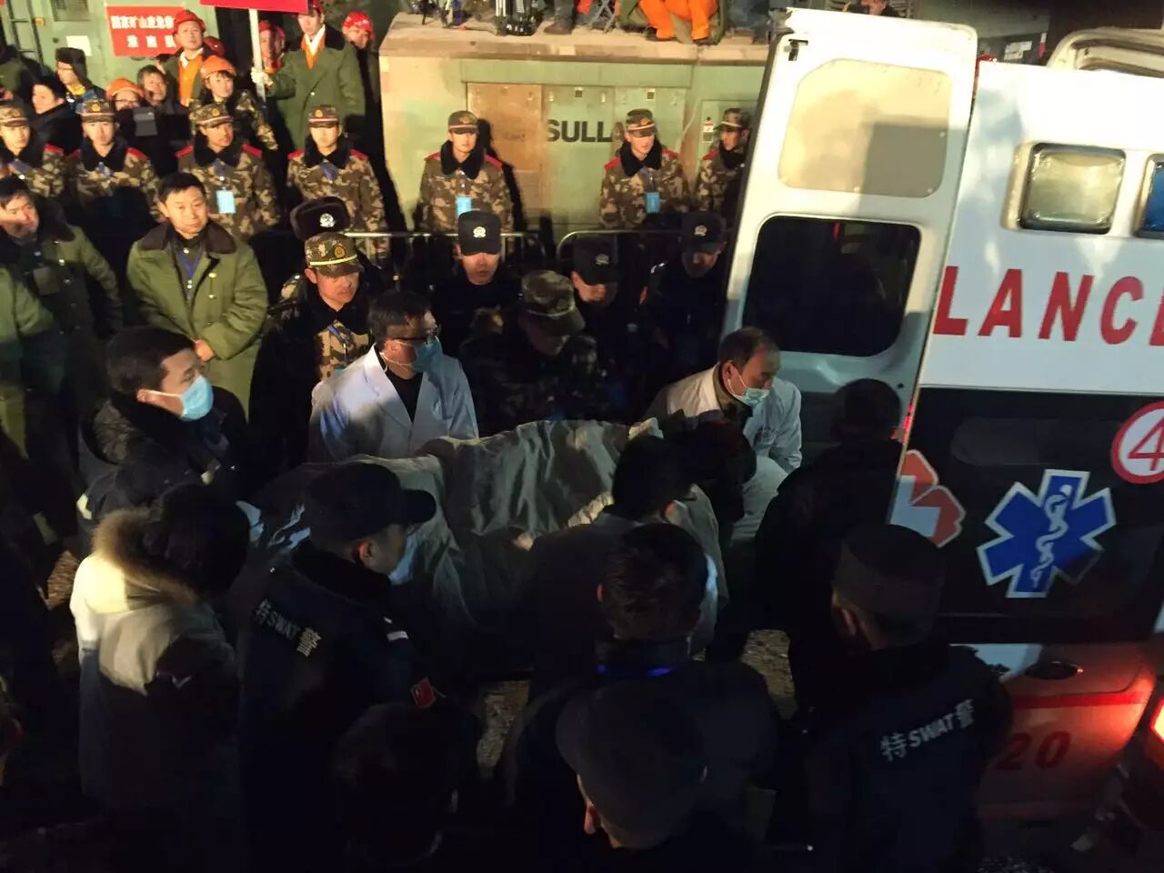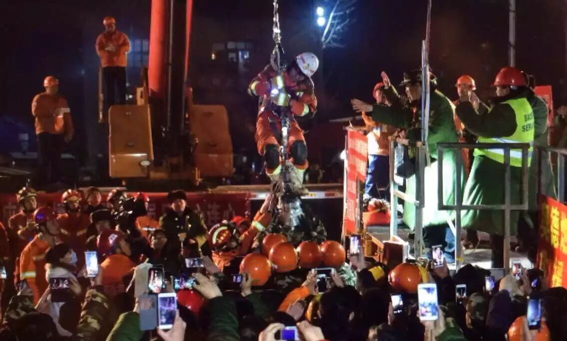 1月29日晚,救生通道再次被疏通,等待已久的救援队员们放下了救生吊带。21时21分,起重机将首名矿工提出地面,救援人员紧急将他送往医院。此后,每隔半个小时,就有一名矿工升井。第四名矿工升井时已经是22时50分,距离事故发生已经过去36天。4名矿工在井下的坚持与等待,终于换来新生!至此,平邑县玉荣石膏矿坍塌事故中被困的29名矿工中,获救人数上升到15人。