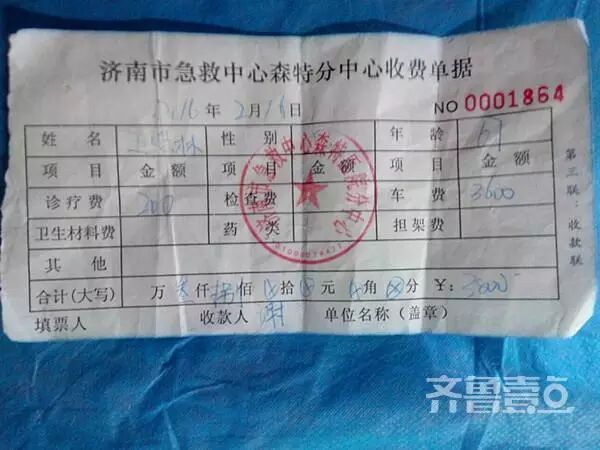 到达目的地后,救护车上的工作人员退给王女士200元钱,并且开了一张收据,收据上写着车费3600元,诊疗费200元,收据盖的是济南市急救中心森特医院分中心的公章。