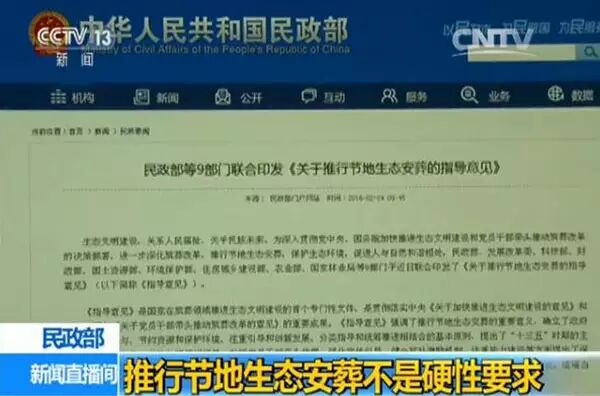 民政部、发改委等9部门今天针对日前出台的《关于推行节地生态安葬的指导意见》举行发布会,相关负责人指出,推行节地生态安葬,不是对广大群众作出的硬性要求,而是通过采取鼓励和引导的方式,让群众逐步接受节地生态、绿色环保要求的安葬理念,进而理解、支持和选择节地生态安葬方式。