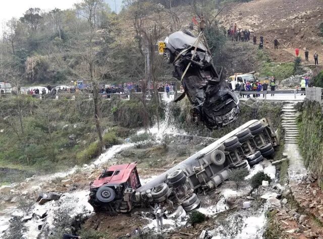 15日中午,一辆装有31吨的硫酸槽罐车沿104国道从苍南分水关向桥墩方向行驶,途经104国道桥墩交通饭店前路段时,因车辆失控,连续碰撞停放在该饭店前的11辆汽车,导致肇事车辆和4辆汽车一同坠入路坎溪旁,造成2人受伤和多辆汽车不同程度损坏。