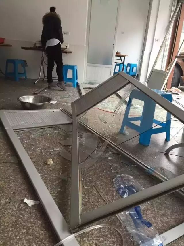 而在路坎边上,正是交通饭店。饭店的一处墙角也被撞塌,一辆起亚轿车正卡在里面,车体受损严重。在饭店正门口,一辆路虎越野车也是被撞得面目全非,其余受损的车辆都已被拖离。