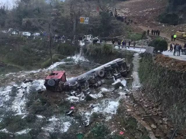 只见在与路面有落差6米的路坎小溪旁,一辆槽罐车正侧翻在地,边上有四辆车子受损严重,分别为宝马、沃尔沃、现代轿车以及一辆皮卡车。此时,苍南群鹰应急救援中心及其他一些民间救援力量已赶到现场,协助官方利用石灰和片碱,对泄露地进行处置,中和硫酸。
