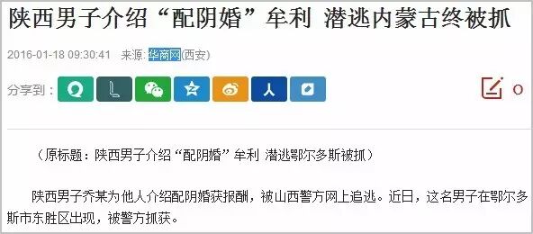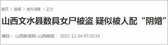 也叫冥婚,常见新闻报道一些偏远的地方,时有发生尸体被盗事件,警方破案:多为犯罪分子牟利,盗挖尸体后,再偷偷出售给有配阴婚寻求的人。