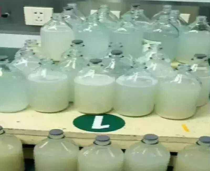随着患者的肺慢慢停止工作,人工肺开始接手维持生命,医生抓住这一时间迅速灌洗患者的肺,经过6个多小时的灌洗,沉淀在患者肺部的蛋白被全部洗出来,一共有45000毫升,90瓶浓白的脏水。