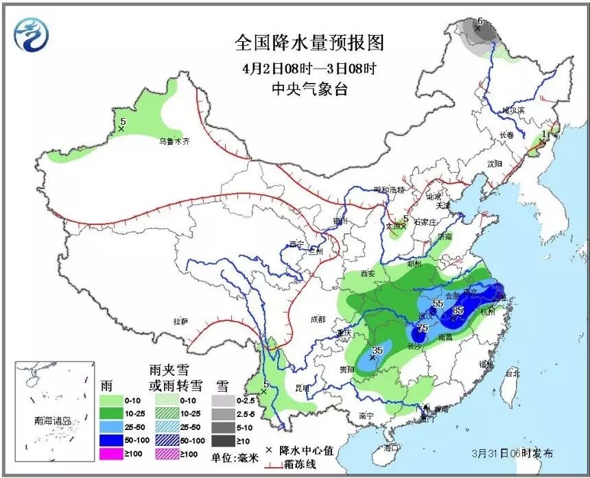 据中央气象台首席预报员方翀介绍,这次的强降雨时段将集中在4月2日的白天和夜间,在安徽、江苏中南部、湖北东部、江西北部、湖南东北部等地的部分地区有暴雨。