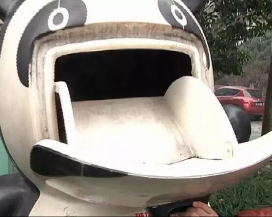 为了调查清楚这些旧衣物的真实去向,记者购买了一款用于防止老人、小孩走失的定位追踪器,装在旧衣物的口袋中,将袋口缝死,之后随机选择了一只用来投放废旧衣物的“大熊猫”,将装有定位追踪器的裤子放进“大熊猫”的肚子里。