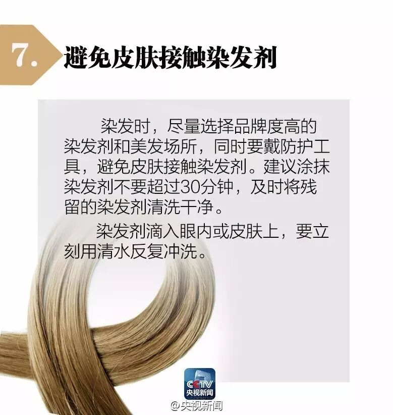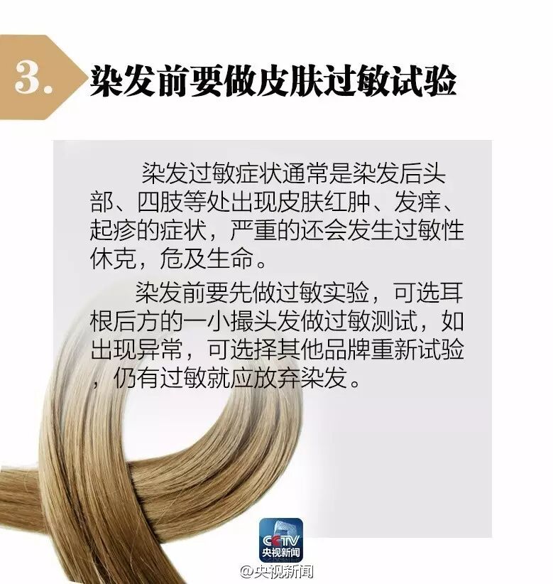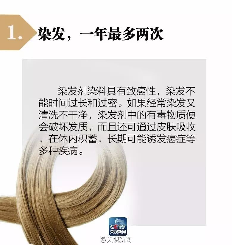 有些爱美人士如今针对白发的解决办法就是一染了之,然而,染发剂中含有化学物质,长期使用会诱发癌症,每次染发前更是要先做过敏试验。染发并不像看起来那么“美丽”,为了健康,这些知识你必须知道。