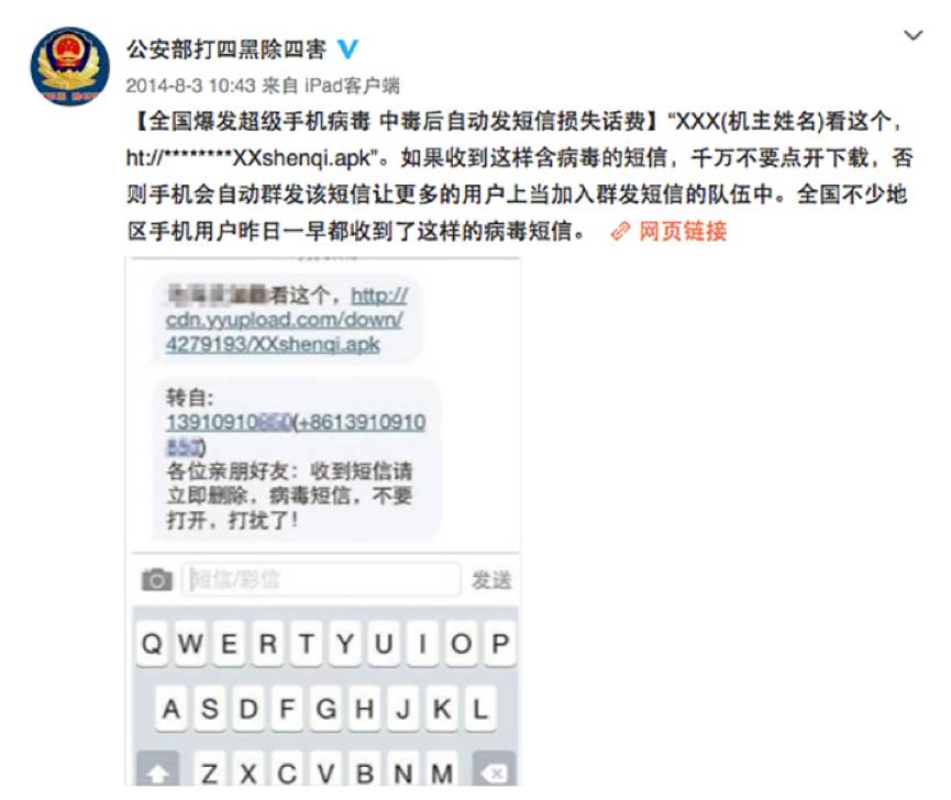 2014年,“XX神器”恶意程序爆发,它利用短信方式大范围传播。“公安部打四黑除四害”、“首都网警”等微博相继发布提醒,该恶意程序一旦在手机下载运行会自动向通讯录群发短信,“XXX(机主姓名)看这个,http://***XXshenqi.apk”。同时窃取手机通讯录或短信等隐私。据估算,被感染用户达数十万。