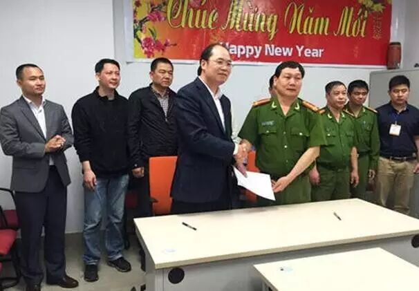 △中国驻越南大使馆警务联络官赵万鹏(前排左一)与越南警方代表出席交接仪式。