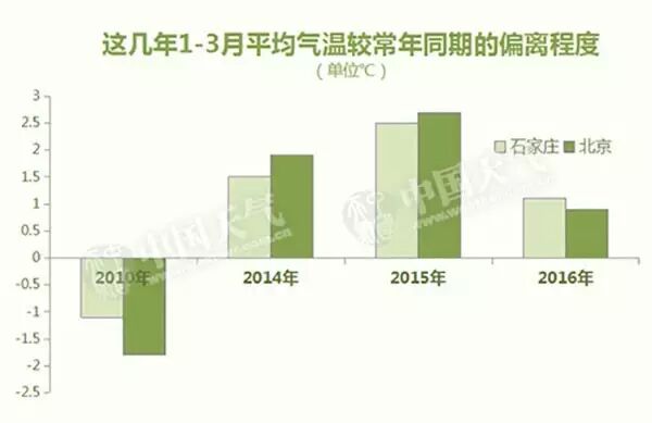 在这个大背景之下,再来看看对杨柳树生长起到重要作用的第一季度气温状况。很明显,石家庄、北京2014-2016年这三年的1-3月份平均气温都是偏高的,而这三年杨絮始飘期也是明显提前的;而2010年作为近几年观测到的飘絮最晚的一年,气温也较常年同期明显偏低。可以说,冬春的平均气温越高,杨柳絮飘飞的时间越早。