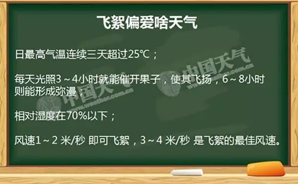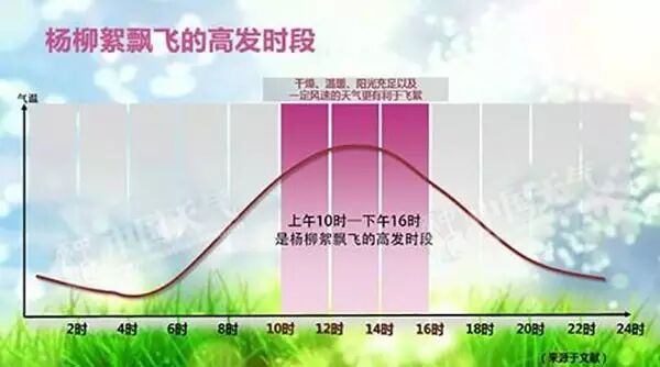 飞絮最喜欢的天气标签有干燥、温暖和阳光充足。根据多年物候观测,当春天白天最高气温连续三天超过25℃,是最有利于种子成熟的温度。而且,晴朗天气时,一般上午10时至下午16时是飞絮的高发时段。因为随着太阳辐射的增强,气温的升高,气流扰动增强,飞絮就会增多。