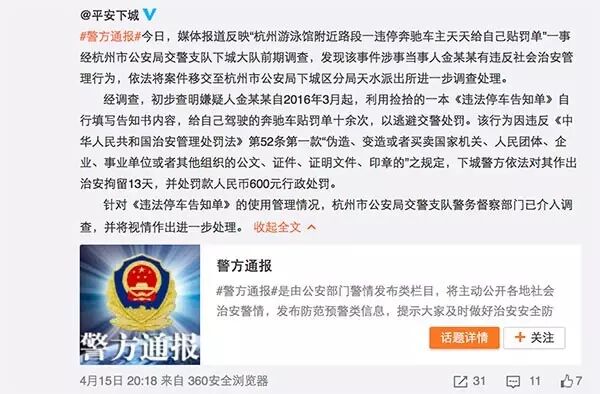 这个案例透露出告知单管理存在有漏洞,针对《违法停车告知单》的使用管理情况,杭州市公安局交警支队警务督察部门已介入调查,并将视情作出进一步处理。