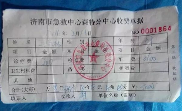 ■2013年12月,网友@老马时评 贴出一张沈阳急救中心的收费单,称从沈阳市和平区胜利街新加坡城到苏家屯血栓医院,仅9公里路程,竟有18项收费,费用高达1670元。