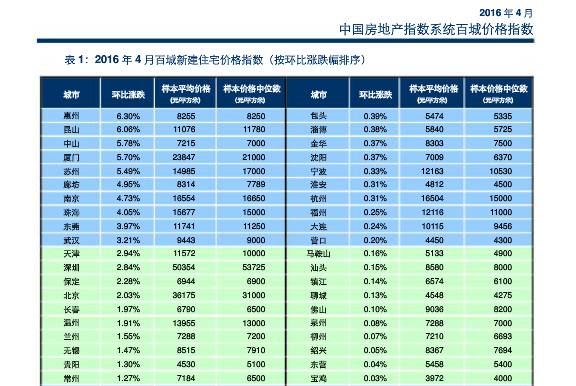 从涨幅排名来看,4月份新建住宅价格环比涨幅居前十位的城市依次是:惠州、昆山、中山、厦门、苏州、廊坊、南京、珠海、东莞、武汉。