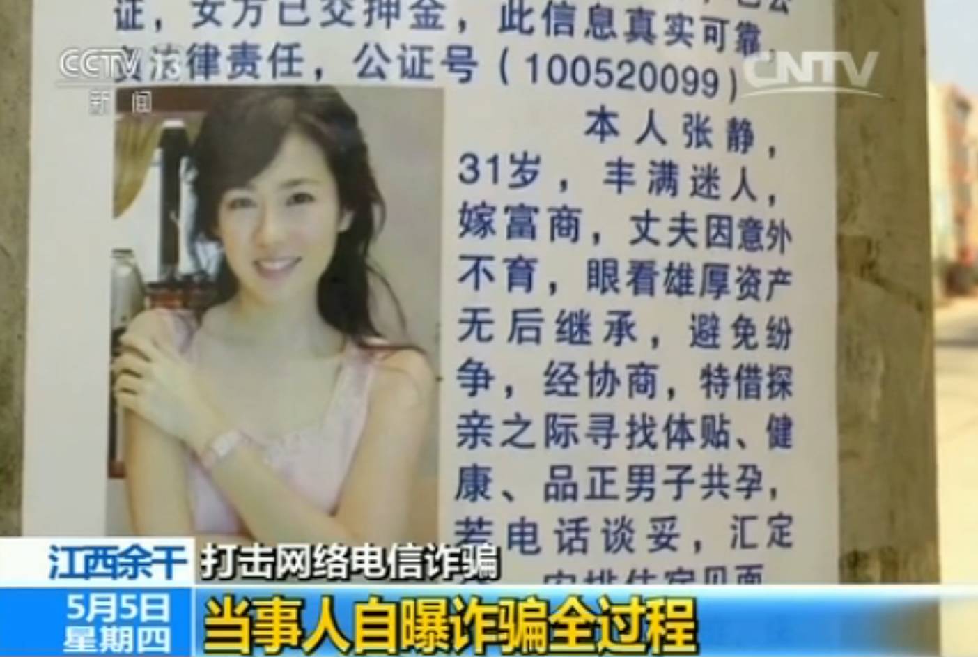 今年3月,在上海打工的王强看到一则广告,上面写着28岁富婆张静,因丈夫身体有缺陷,想找人生孩子,怀孕成功后重谢。广告上的张静年轻、迷人,40多岁的王强心动了。抱着试试的心态,王强拨通了张静的电话,一来二去两人聊出了感情,王强提出要见面。这时,张静则要求“付诚意金”后再见面。按照要求,王强给张静汇了9000元诚意金,可没想到钱一汇完就再也联系不上张静了,王强感觉自己上当了。