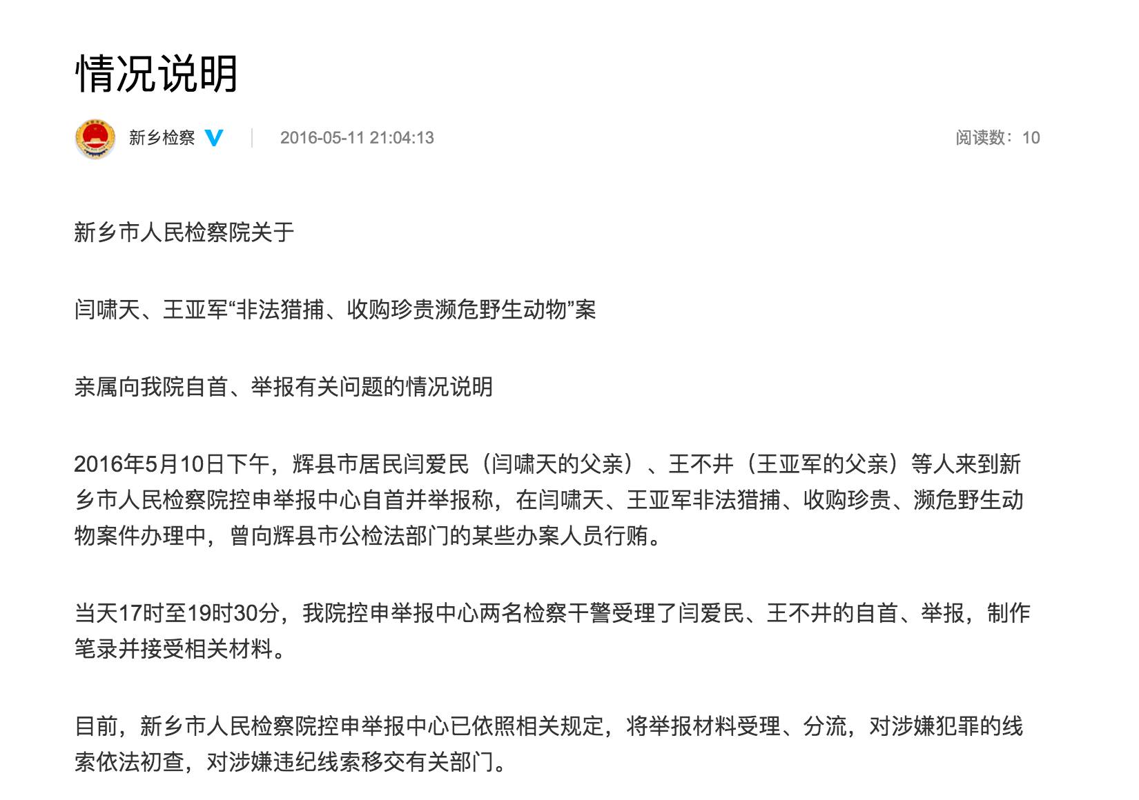 11日晚间,河南新乡市人民检察院通过官方微博,对“闫啸天、王亚军非法猎捕、收购珍贵、濒危野生动物案”亲属自首、举报有关问题的情况进行说明。