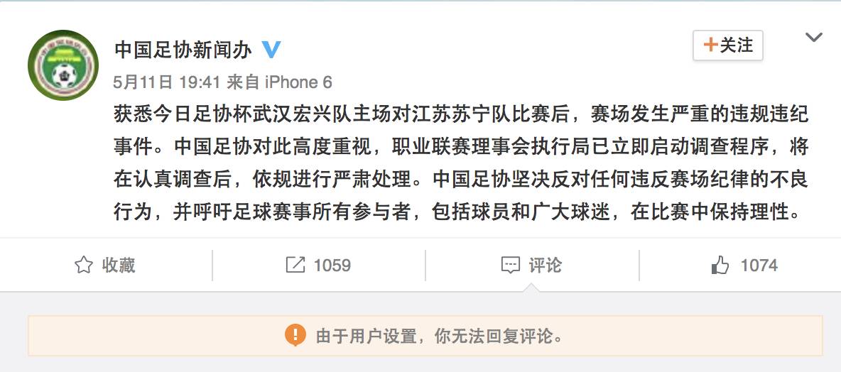 中国足协昨晚通过微博发表声明说:“获悉今日足协杯武汉宏兴队主场对江苏苏宁队比赛后,赛场发生严重的违规违纪事件。中国足协对此高度重视,职业联赛理事会执行局已立即启动调查程序,将在认真调查后,依规进行严肃处理。中国足协坚决反对任何违反赛场纪律的不良行为,并呼吁足球赛事所有参与者,包括球员和广大球迷,在比赛中保持理性。”
