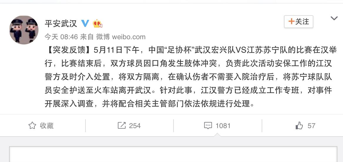 据悉,苏宁俱乐部第一时间报警,同时向中国足协上报了情况,希望通过相关法律法规处理该事件。今天,武汉市公安局官方微博发布消息,称针对此事,武汉江汉警方已经成立工作专班,对事件开展深入调查,并将配合相关主管部门依法依规进行处理。