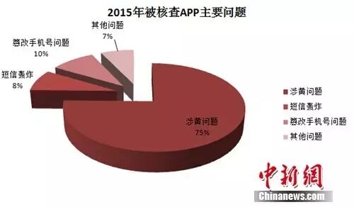 其一,涉黄问题。有75%的被核查APP存在涉黄问题,其中匿名社交类App问题突出,包括用户发布色情信息、提供色情服务、发布色情图片、视频和文字等情况。