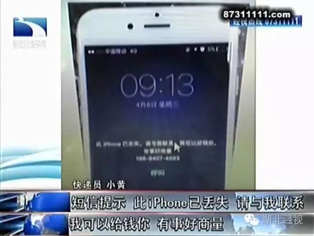 小黄再次听到包裹里的响声后,打开一看,发现手机屏幕上显示这样一条短信提示:“此iPhone已丢失,请与我联系,我可以给钱你,有事好商量……”
