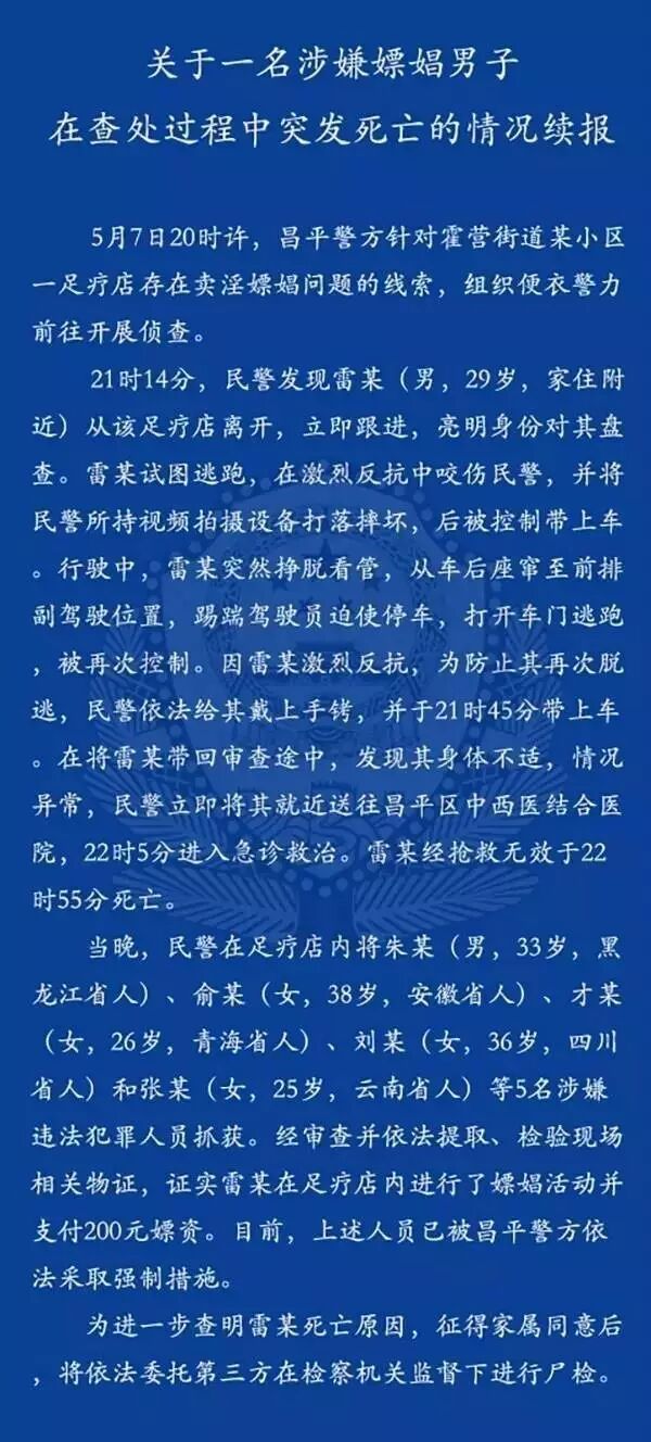 5月11日凌晨,北京市公安局昌平分局官方微博@平安昌平发布《关于一名涉嫌嫖娼男子在查处过程中突发死亡的情况续报》,称雷某在逃跑过程中激烈反抗,不但咬伤民警,还将民警拍摄设备打落摔坏。此外,有相关物证可证实雷某存在嫖娼行为,并支付了200元嫖资。