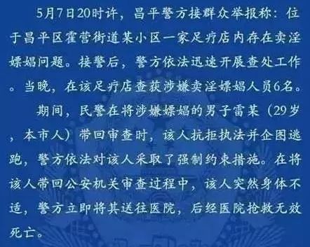 >>>新闻链接:北京一男子“涉嫖”后突然死亡 警方、家属和医院回应