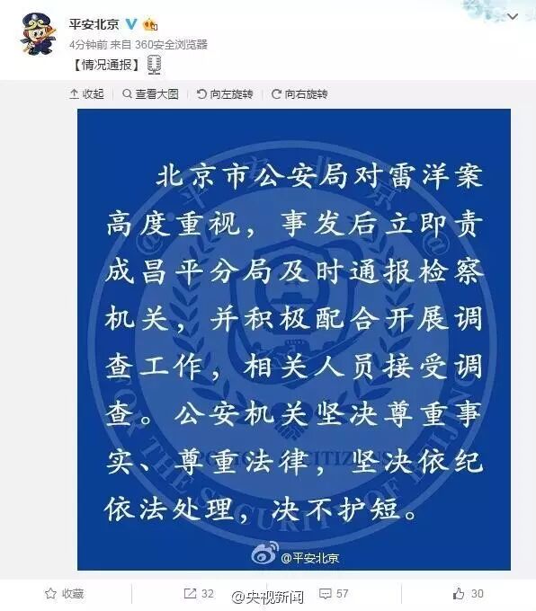 随后,北京市公安局通过官方微博表示,对雷洋案高度重视。公安机关坚决尊重事实、尊重法律,坚决依纪依法处理,决不护短。