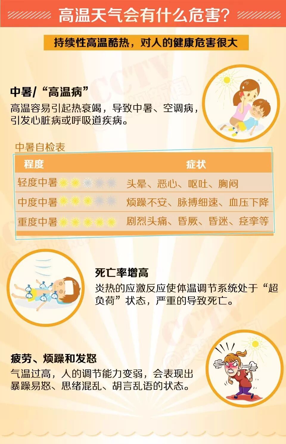 此轮高温天气持续时间长、加上空气湿度大,对于个体来说,体感温度将比气温更高。高温高湿天气可能引发中暑等症状,这些危害不容忽视——