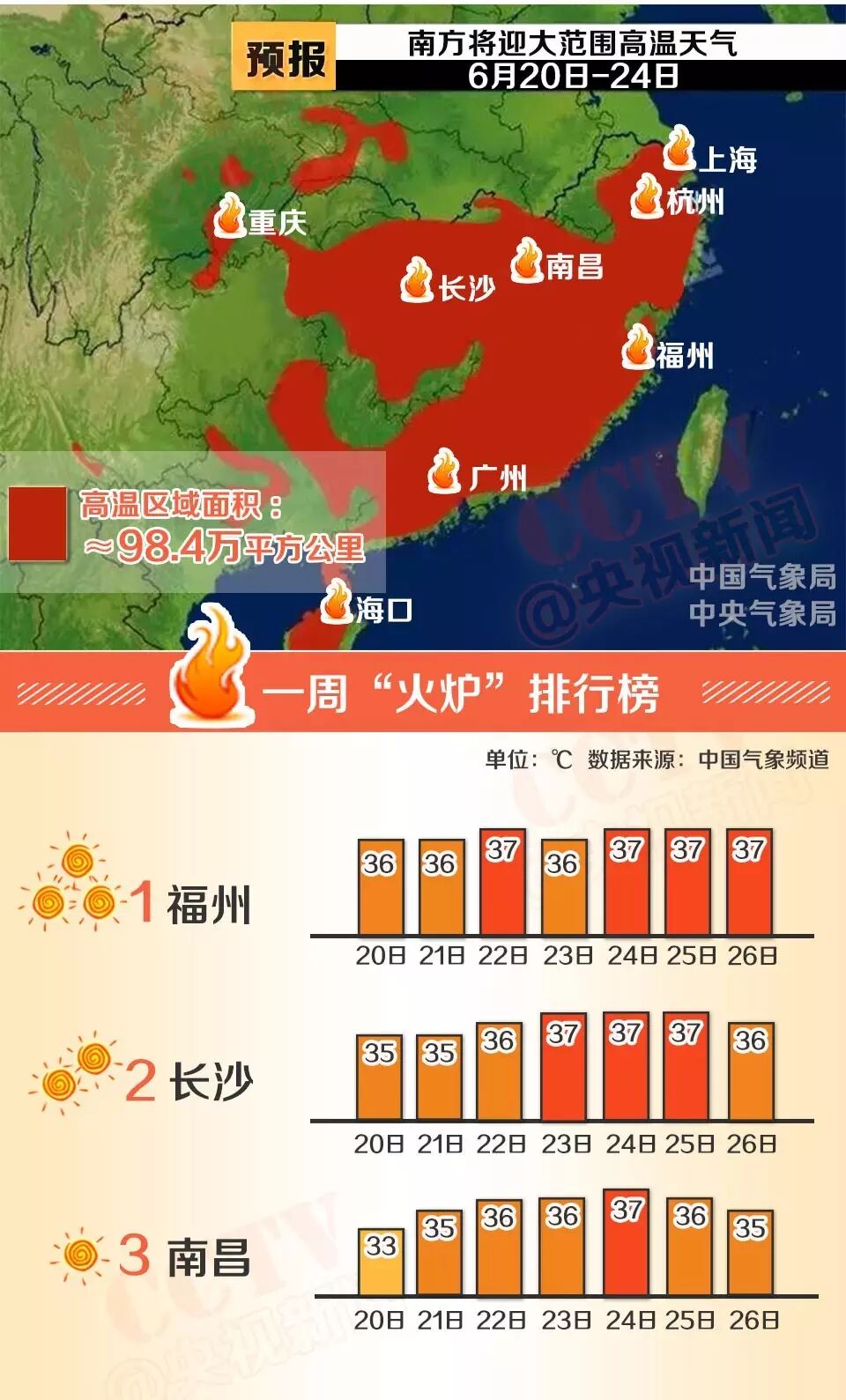 明天就是夏至了!高温来了!前两天,中央气象台发布重要天气预告:中国江南、华南地区大范围持续性高温晴热天气开始了!大部地区日最高气温将在35~39℃之间,局部地区可达40~41℃,这样的高温天气将持续10天以上。这一周的火炉排行榜都有哪些城市,看看有你家吗?