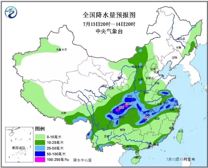 预报显示,上述地区的累计雨量普遍有50~90毫米,其中四川盆地东北部和西南部、湖北西部和东部、安徽南部、江西北部、浙江西北部、江苏中部等地的部分地区有100~130毫米,局地有150~200毫米;太湖流域累计降雨量有50~80毫米,局地有100~120毫米。降雨的主要时段在14日至15日,上述地区小时雨强可达20~50毫米,局地可超过70毫米。