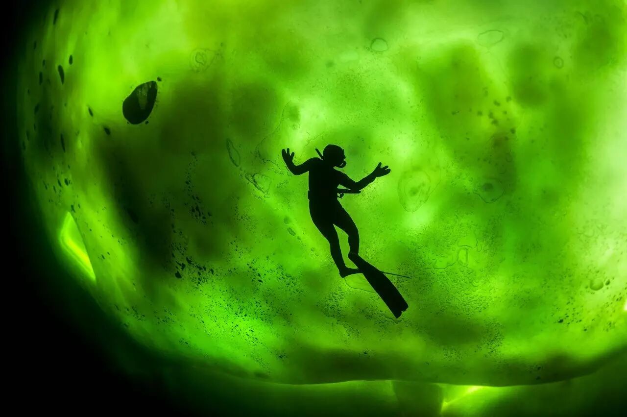 △北极光惊人的背景映衬下,一名在厚冰下游泳的潜水员的轮廓。