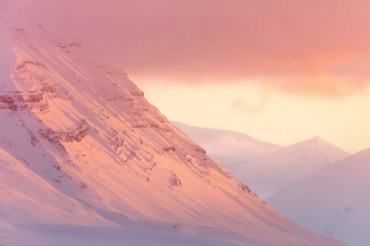 由于冰晶云的散射作用,在北极还常常可以看到大气晖光,整个天空被淡红、绛紫、橙黄等各种鲜艳的颜色妆扮起来,显得格外美丽。