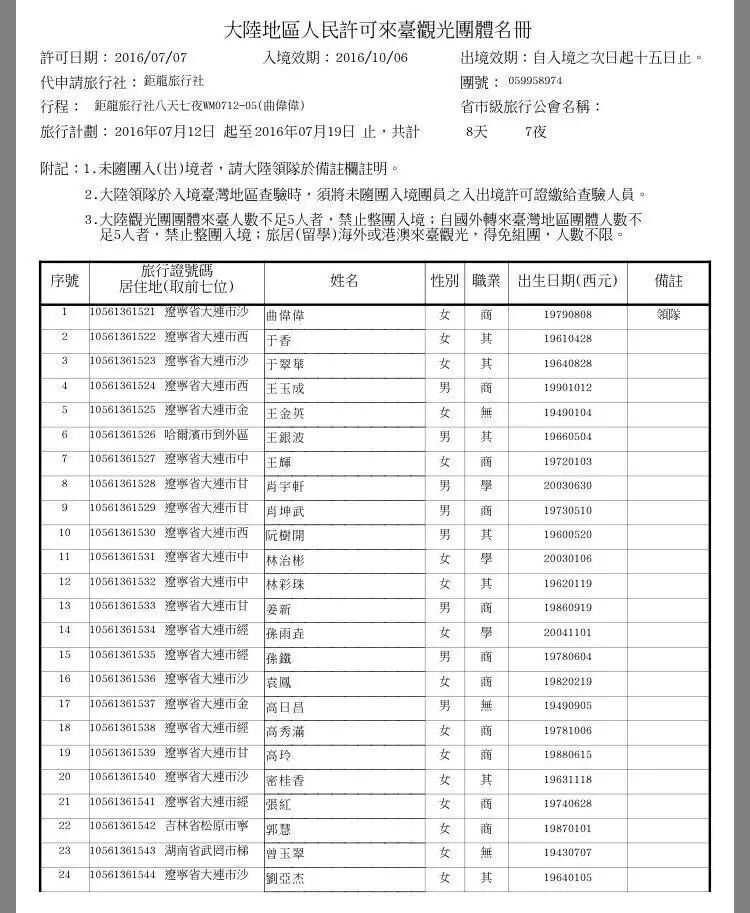 台消防部门表示,车上是来自辽宁省大连市的旅行团,含领队、司机共26人,旅客24人中8名男性,16名女性,其中包括两名13岁、一名12岁的孩子。该团由钜龙旅行社承办,自本月12日入台进行8日游,原预计今天16:30搭机返回大连。