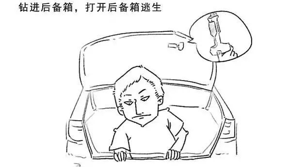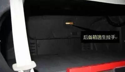 不少品牌轿车在后备箱设计了一个拉环,将后排座椅放倒,人爬到后备箱内,可启用拉环从车内以机械方式开启后备箱,进而逃生。