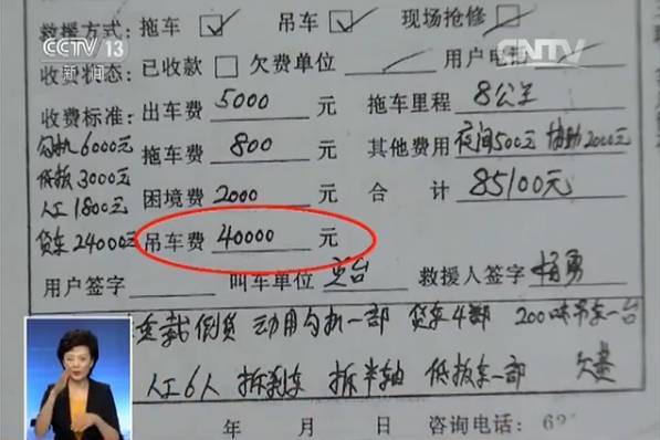 从单子上记者看到,救援费用包括:出车费、拖车费、困境费、吊车费、夜间费、协助费,勾机、板车、人工、货车费等。其中,一台75吨吊车,收费1.5万元;一台200吨吊车,收费4万元。那这些费用的收费依据是什么呢?