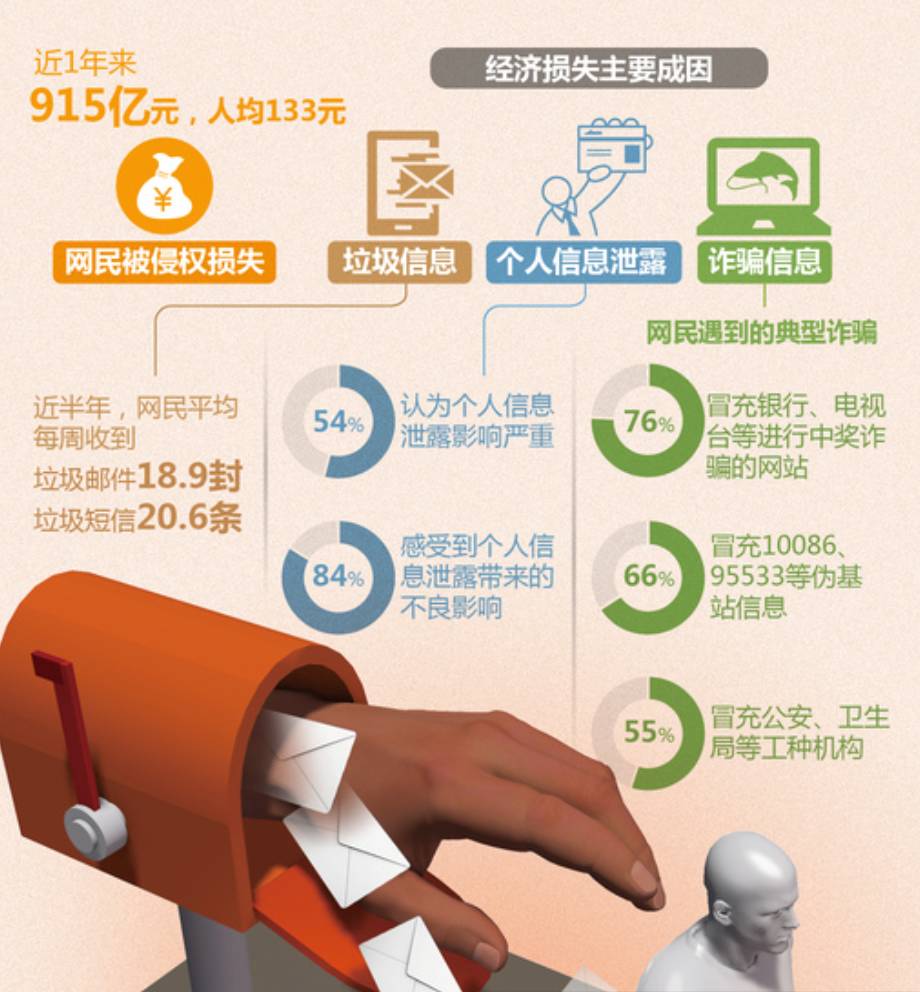 据中国互联网协会发布的《中国网民权益保护调查报告2016》,近一年来,中国网民因垃圾短信、诈骗信息、个人信息泄露等造成的经济损失估算达915亿元。