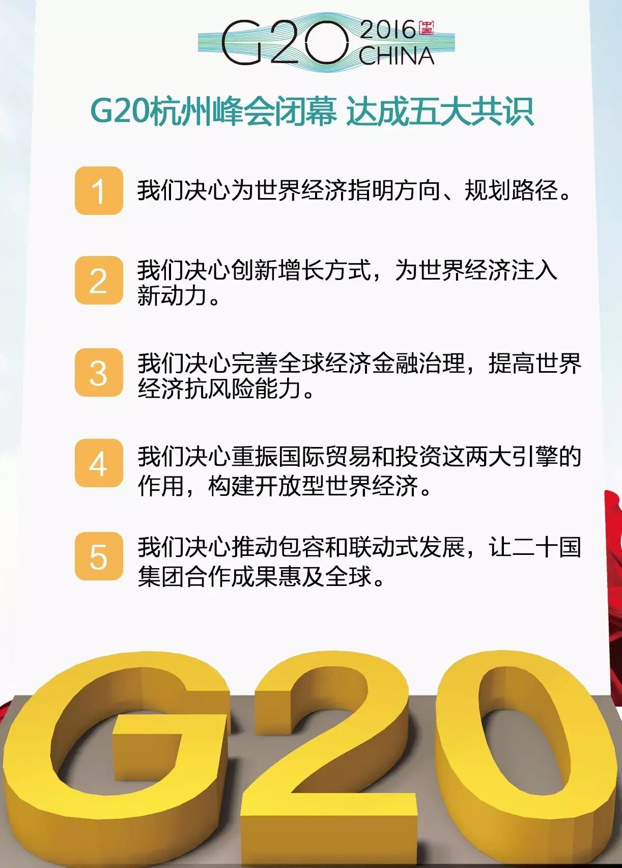 下午5时许,峰会落下帷幕。习近平在闭幕辞中指出,通过热烈而富有成果的讨论,在各方共同努力下,二十国集团领导人杭州峰会达成许多重要共识。
