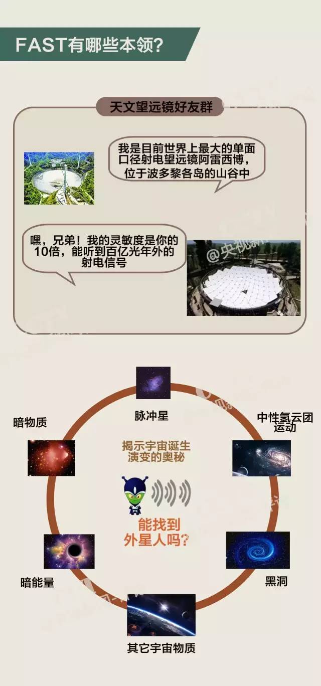 FAST望远镜将对脉冲星、类星体等各种暗弱辐射源进行更精密观测。宇宙中的生命体或高智商“外星人”若存在于浩瀚天宇中,也有可能被FAST探测并接收到。