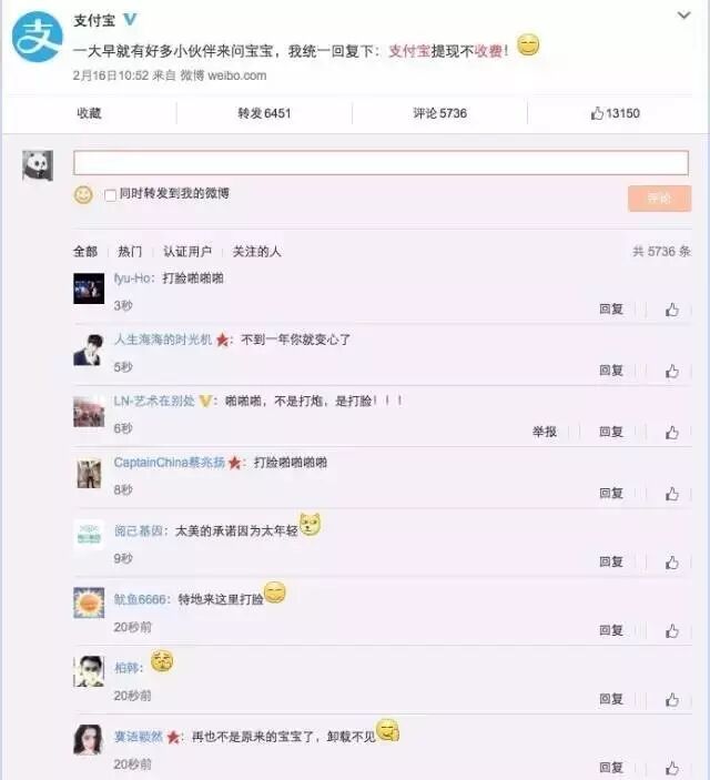 支付宝曾在微信公布收取提现手续费后,第一时间回应,支付宝提现不收费!今日公告一出,网友纷纷留言,你还是那个承诺不收费的宝宝吗?